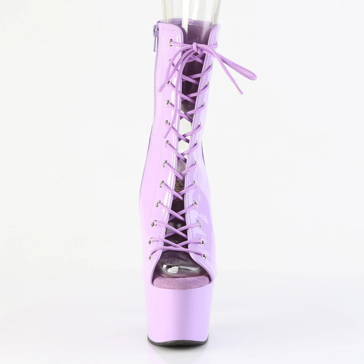 Poderosa e elegante: uma bota que eleva instantaneamente qualquer look. A plataforma ajuda a distribuir o peso do pé e melhora a estabilidade ao caminhar. Detalhes que fazem toda a diferença: acabamento em PU, sola em borracha, verniz na cor lavanda. Altura total aproximada de 18 cm com a plataforma: máximo impacto visual sem sacrificar o controlo.