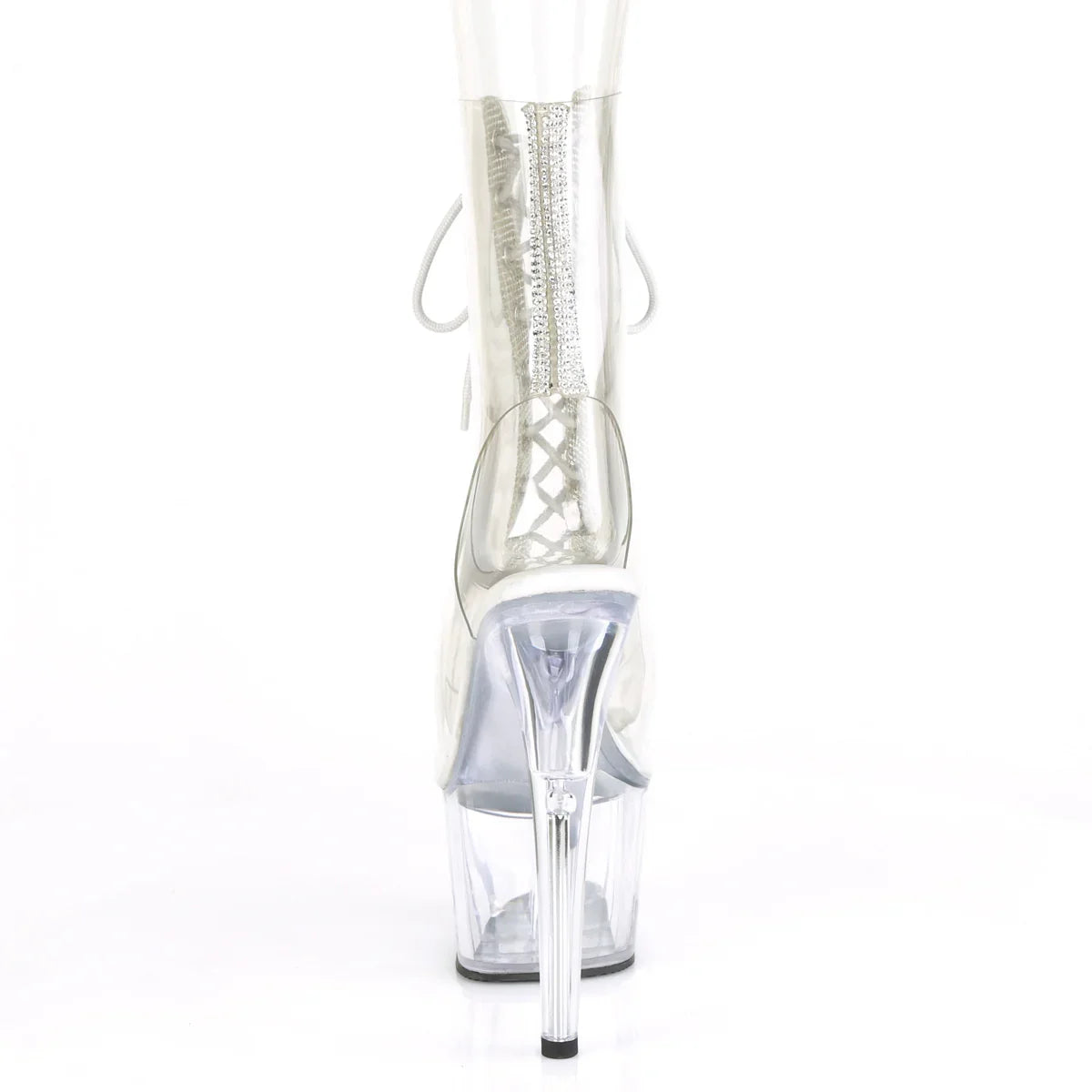 Poderosa e elegante: uma bota que eleva instantaneamente qualquer look. A plataforma ajuda a distribuir o peso do pé e melhora a estabilidade ao caminhar. Detalhes que fazem toda a diferença: acabamento em PVC, sola em borracha, cor transparente. Altura total aproximada de 18 cm com a plataforma: máximo impacto visual sem sacrificar o controlo.