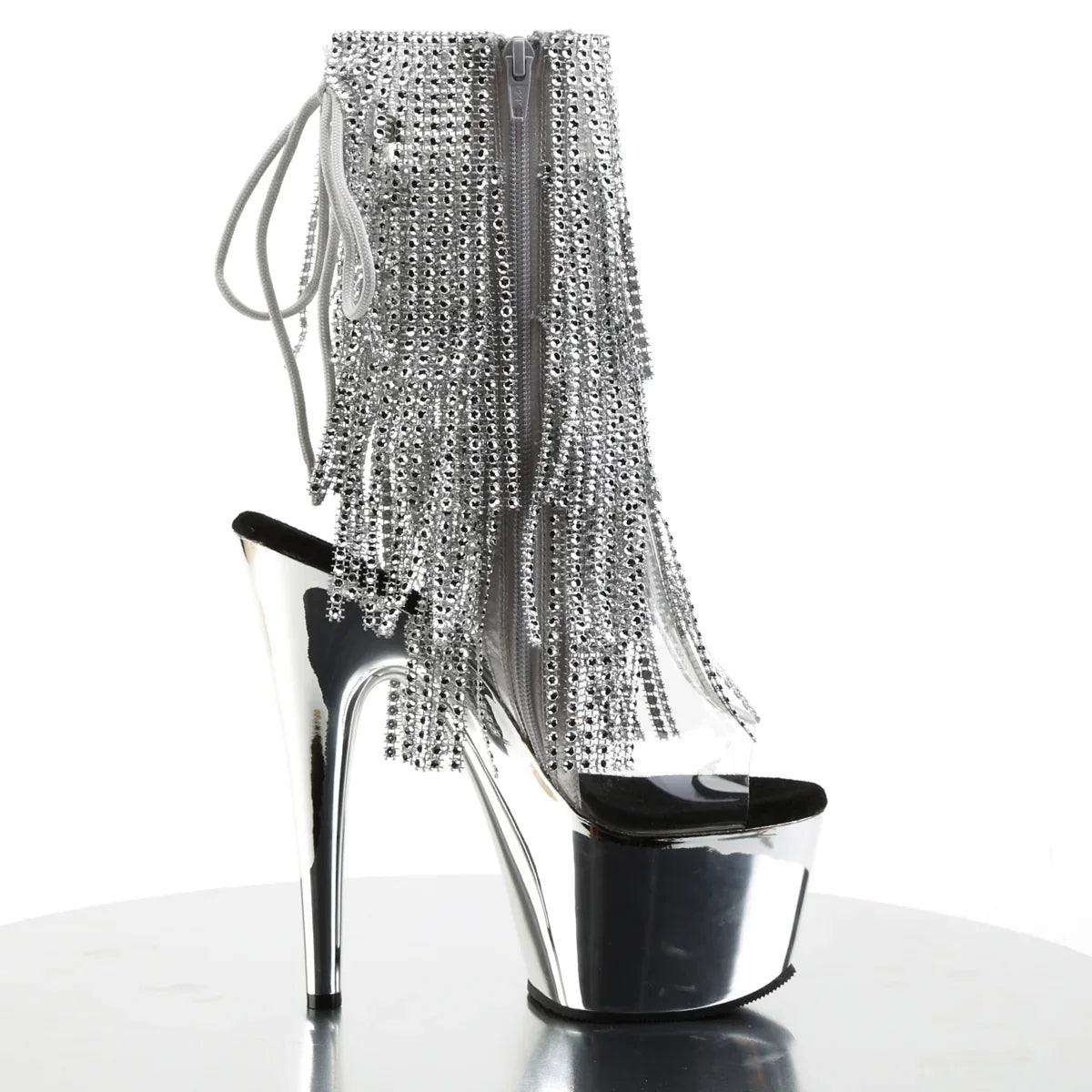Poderosa e elegante: uma bota que eleva instantaneamente qualquer look. A plataforma ajuda a distribuir o peso do pé e melhora a estabilidade ao caminhar. Detalhes que fazem toda a diferença: acabamento em PVC, sola em borracha, cor prata transparente/prata cromada. Altura total aproximada de 18 cm com a plataforma: máximo impacto visual sem sacrificar o controlo.
