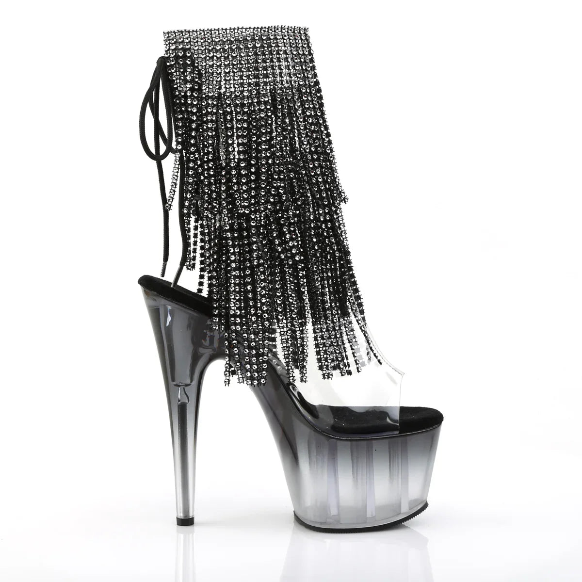 Poderosa e elegante: uma bota que eleva instantaneamente qualquer look. A plataforma ajuda a distribuir o peso do pé e melhora a estabilidade ao caminhar. Detalhes que fazem toda a diferença: acabamento em PVC, sola em borracha, cor preto transparente/preto. Altura total aproximada de 18 cm com a plataforma: máximo impacto visual sem sacrificar o controlo.