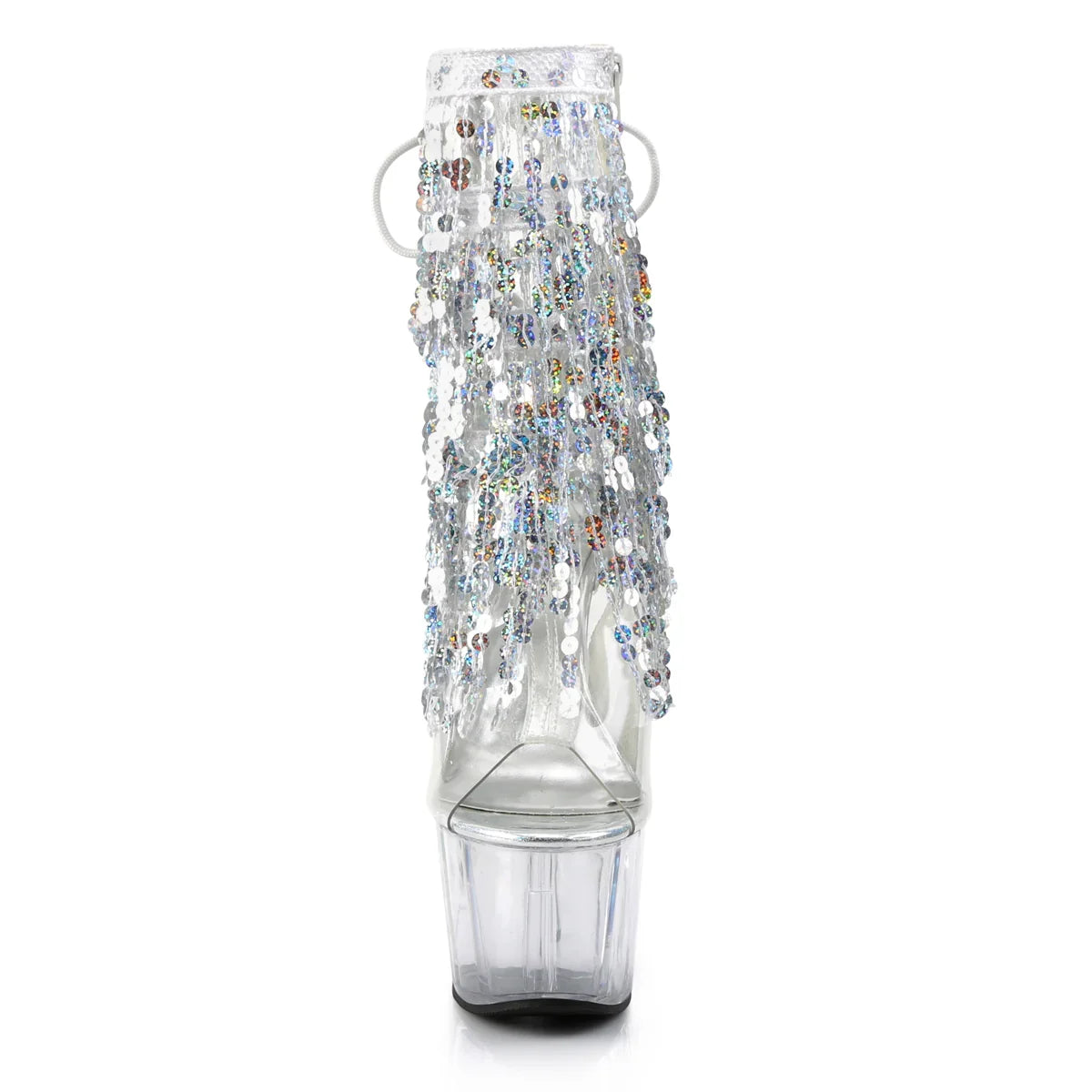 Poderosa e elegante: uma bota que eleva instantaneamente qualquer look. A plataforma ajuda a distribuir o peso do pé e melhora a estabilidade ao caminhar. Detalhes que fazem toda a diferença: acabamento em PVC, sola em borracha, cor transparente - prata holográfica/transparente. Altura total aproximada de 18 cm com a plataforma: máximo impacto visual, sem sacrificar o controlo.