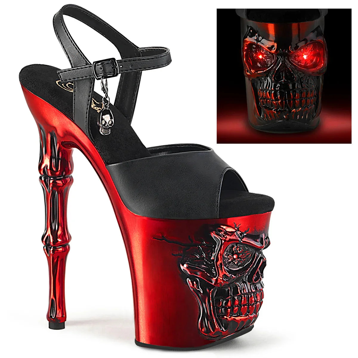 Para elevar instantaneamente qualquer look: presença, altura e muito estilo. Uma sandália com personalidade: realça e eleva qualquer look. Detalhes principais: plataforma para maior estabilidade, acabamento em PU, sola em borracha, pele sintética preta/cetim cromado vermelho, modelo vegan. Altura aproximada: salto de 20 cm + plataforma de 10 cm. Se procura uma transformação com impacto imediato, encontrou.
