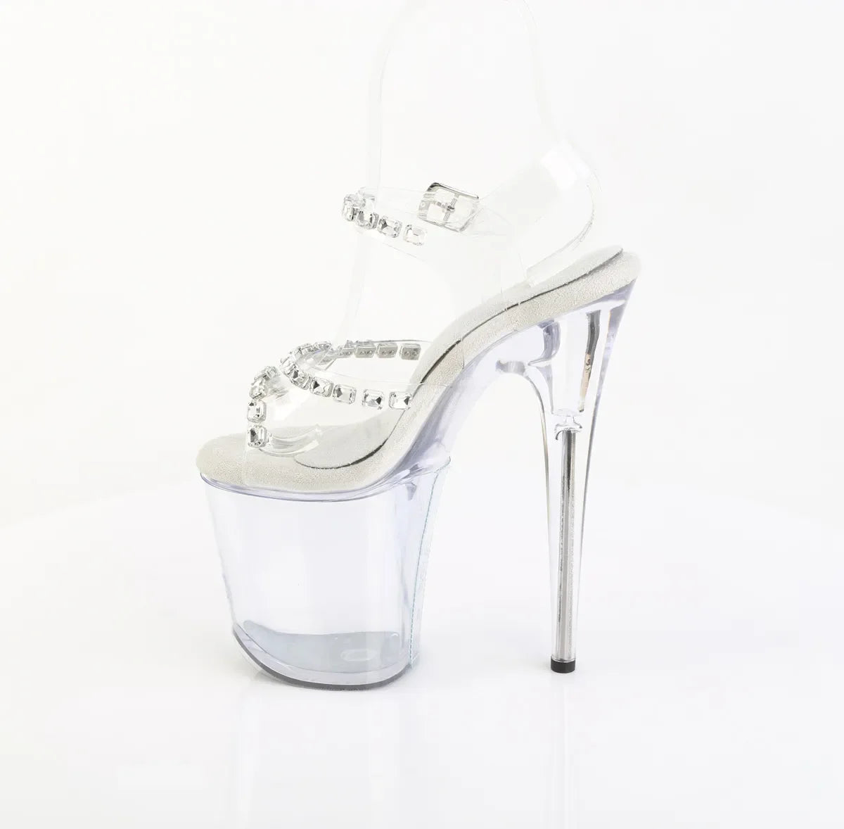 Aprimore as suas habilidades em Pole Dance Exótico com uma sandália que combina impacto visual e conforto . Este modelo apresenta uma parte superior premium em TPU transparente com bordas macias e arredondadas para um ajuste mais confortável, bem como um acabamento brilhante com strass que se destaca a cada movimento.